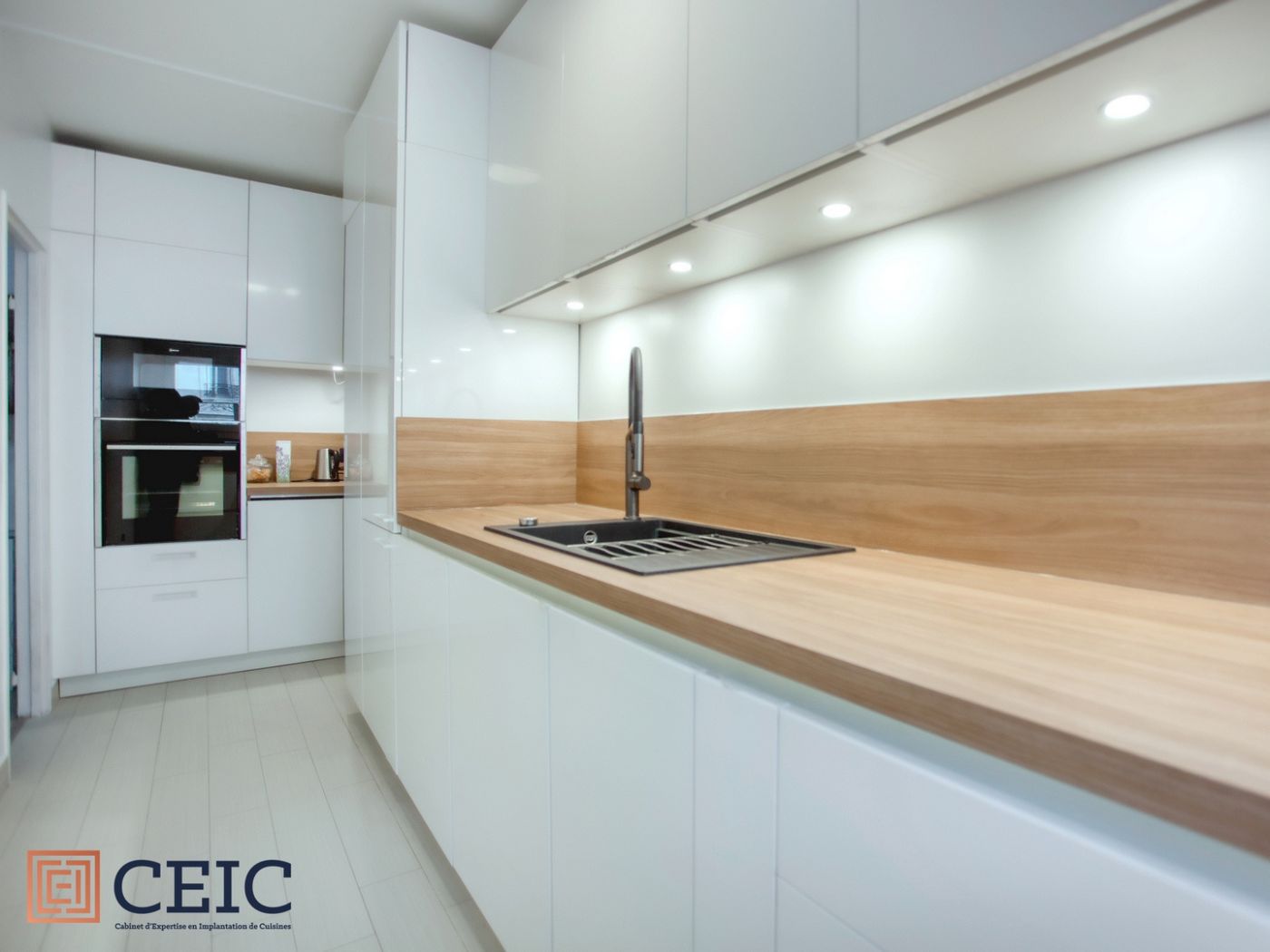 Notre cuisiniste Paris 15 a optimisé cet espace en longueur en y apportant une ergonomie et une élégance adaptée à la demande de cliente.